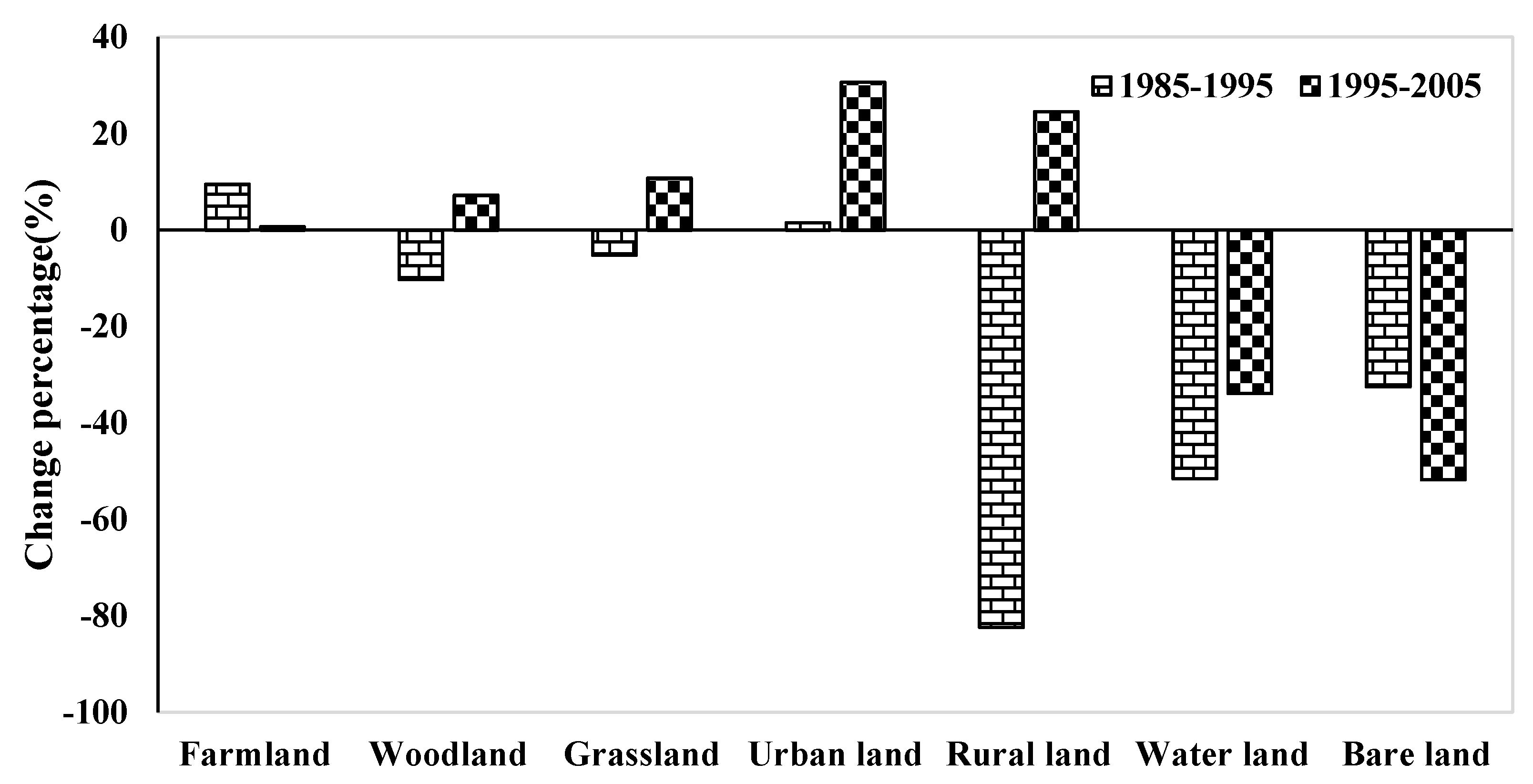 Figure 7). The results show that the dominant land cover types during the three periods were farmland, woodland and grassland, which together account for approximately 98% of the entire basin. Compared to the baseline period, there is little percentage change (less than 10%) in the area occupied by these land cover types during the 1990s and 2000s (