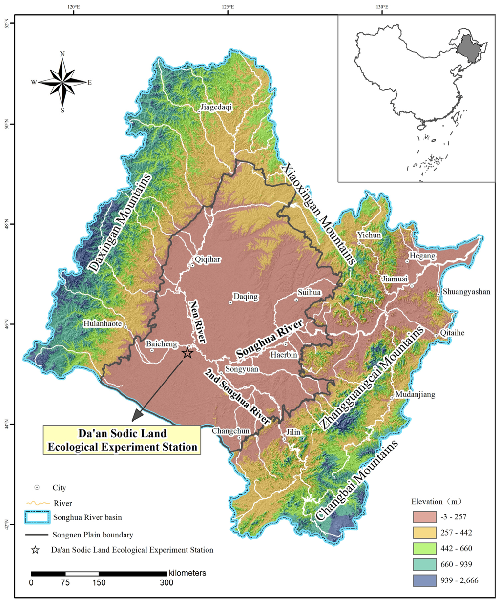 The experiment is carried out in Da’an Sodic Land Ecological Experiment Station of Northeast Institute of Geography and Agroecology, Chinese Academy of Sciences (Figure 1). This region is located in 123°50′27″–123°51′31″ of east longitude and 45°35′58″–45°36′28″ of north latitude, and features temperate continental monsoon climate with an average annual precipitation of 413.7 mm and an average annual evaporation of 1696.9 mm. The experiment station is surrounded by low flood plain for Nenjiang ancient channel. The land surface is featureless and gently undulating, with the alternate distribution of small mounds and depressions. The complex coexistence of different level of soil salinity–sodicity is the common characteristics in Songnen Plain, northeast China [24].