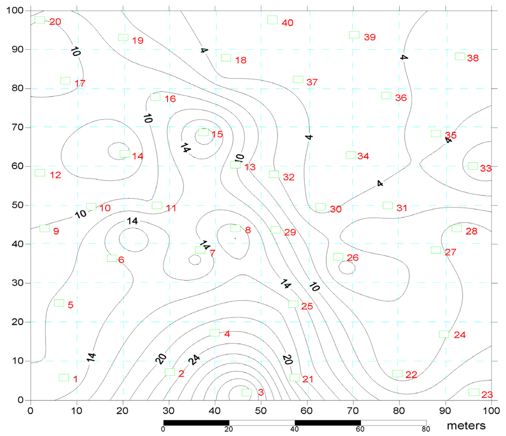 A representative saline-sodic area measuring 100 m × 100 m was selected with the saline-sodic soil complex of different soil salinity–sodicity levels. A ridge was constructed along the boundary of the area in case surface runoff entered the area after rainfall events. The ridge was 36 cm high and 40 cm wide. The experiment area was divided into 10 m × 10 m grid squares, and 40 grids were randomly selected as sampling points (Figure 2). The land surface in the area is gently undulating with microtopography of coexistence of mounds and depressions. The maximum difference in elevation is about 36 cm. The grids with the highest elevation (such as sampling points of No. 2, No. 3, No. 4 and No. 21) are located in the middle bottom (Figure 2). The grids having the lowest elevation (such as sampling points of No. 33, No. 34, No. 36, No. 37, No. 39 and No. 40) are located in the top right corner (Figure 2). Soil of experiment area was naturally saline-sodic soils without tillage and grazing disturbances. The plant communities in this area mainly include Phragmitesaustralis, Chlorisvirgata, Suaedaglauca and Puccinelliatenuiflora. Typically, Suaedaglauca is distributed in the highest elevation area (mounds), and Phragmitesaustralis is found in the lowest elevation area (depressions). The soil type is loam soil by USDA textural classification triangle. Dry bulk density ranged 1.49 to 1.67 g/cm3. Shallow groundwater level is lower than 5 m. The shallow groundwater has the high values of TDS (0.2%–0.4%), and pH ranges from 7.2 to 7.9. The main ions of the shallow groundwater are Na+, Mg2+, HCO3− and Cl−.