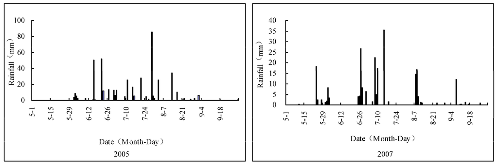 In this experiment, two years data were selected to analyze correlation between surface soil salinity–sodicity and environment factors under dry and wet conditions. The 50-year (1951–2009) average rainfall during May to October in the study area is approximately 350.7 mm. Year 2005, with rainfall of 455.9 mm during May to October, was selected to represent the wet condition. Year 2007 was selected to represent the dry condition with the rainfall of 224.5 mm during May to October (Figure 3).