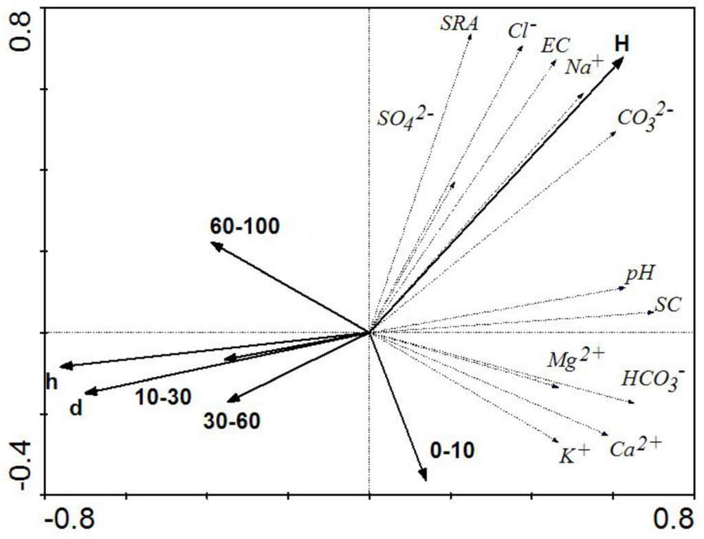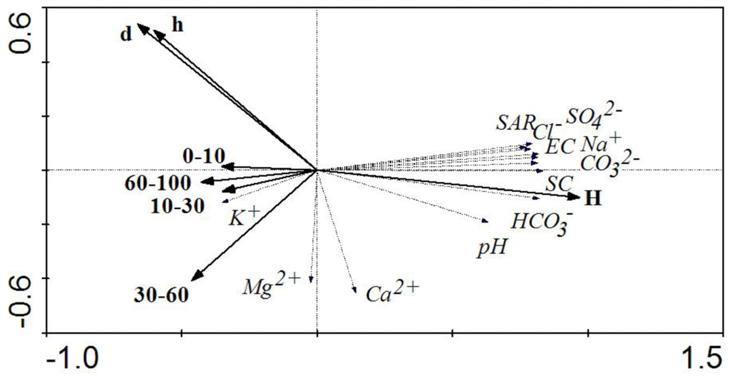 RDA computation was performed using CANOCO for Windows 4.5 [27]. In the RDA computations, the correlation matrix option was selected, and scaling was conducted on a correlation bi-plot. In each analysis, step-wise forward selection was used to reduce the environmental variables to those most correlated with the axes. The significance of each environmental variable was tested using 499 unrestricted Monte Carlo permutations. For each analysis, the variance explanation of each environmental variable (marginal effect), and their additional variance explained when included in the model (conditional effect) [27] were also provided. The redundancy analysis (RDA) method is capable of presenting the research objects ordination and environment factors ordination in one diagram, and the relationships can be directly observed between them. The research objects are represented by the dotted arrow, the solid arrow represents the environment factors, and the quadrant that the arrow lies in indicates positive and negative correlations between environment factors (research objects) and ordination axes. The length of solid arrow connecting line means correlation between an environment factor and research object distribution, i.e., the longer line indicates that the environment factor has more influences on the distribution of research object. The angle between two arrows means the correlation between two environment factors (research objects), i.e., the smaller angle determines greater relevance. The angle between the arrow and ordination axis means the correlation between an environment factor (research objects) and ordination axis [23]. In this study, research objectives are soil ions (Na+, Ca2+, Mg2+, K+, CO32−, HCO3−, SO42− and Cl−), soil salt content (SC), electrical conductivity (EC), sodium adsorption ratio (SAR), and pH. Considered environmental factors include surface ponding time (d), surface ponding depth (h), soil moistures in different soil layers (W0–10, W10–30, W30–60, and W60–100), and ground elevation (H).