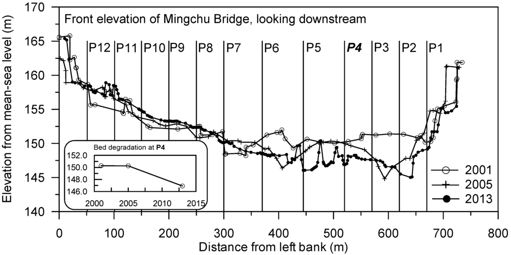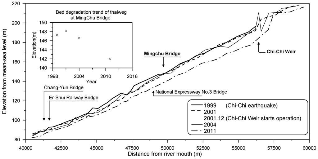 Variations of longitudinal riverbed profiles of Cho-Shui River near Mingchu Bridge.