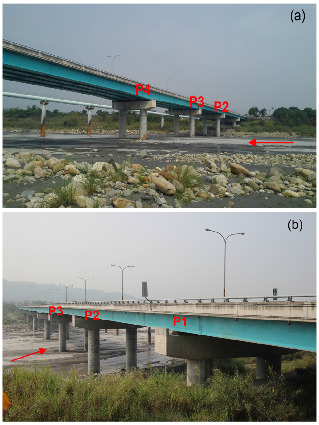 - Hong, J.H.; Chiew, Y.M.; Lu, J.Y.; Lai, J.S.; Lin, Y.B. Case study: Houfong Bridge failure in Taiwan. J. Hydraul. Eng. 2012, 138, 186–199. [Google Scholar] [CrossRef]