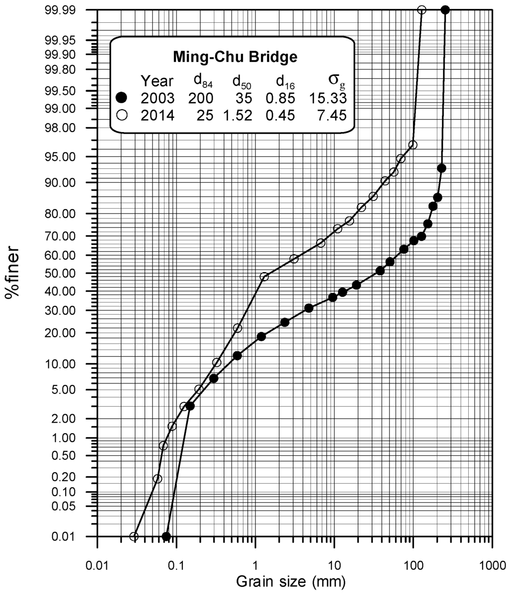 The bed sediment consists of coarse alluvial gravels together with sands. Figure 4 shows a close-up view of the Mingchu Bridge, indicating that the bed material at this bridge is characterized by a wide range of sediment particle distribution. Furthermore, Figure 5 shows the sediment particle size distributions around Pier 4 of the Mingchu Bridge obtained in 2003 and 2014, respectively. The results of the survey conducted in 2003 indicated a median sediment size of d50 = 35 mm, with a geometric standard deviation of sediment size () 15.33, where d16 and d84 = particle size for which 16% and 84% are finer by weight, respectively. However, the survey results in 2014 indicated a median sediment size of d50 = 1.52 mm, with a geometric standard deviation of sediment size σg = 7.45. The data show that the sediment particle distribution at the bridge site clearly has become more uniformly distributed. Moreover, the median grain size has changed from that of coarse gravel to coarse sand. The change in the bed material composition at the Mingchu Bridge over the past decade is significant as it reflects the effect of the Chi-Chi Weir in reducing sediment supply.