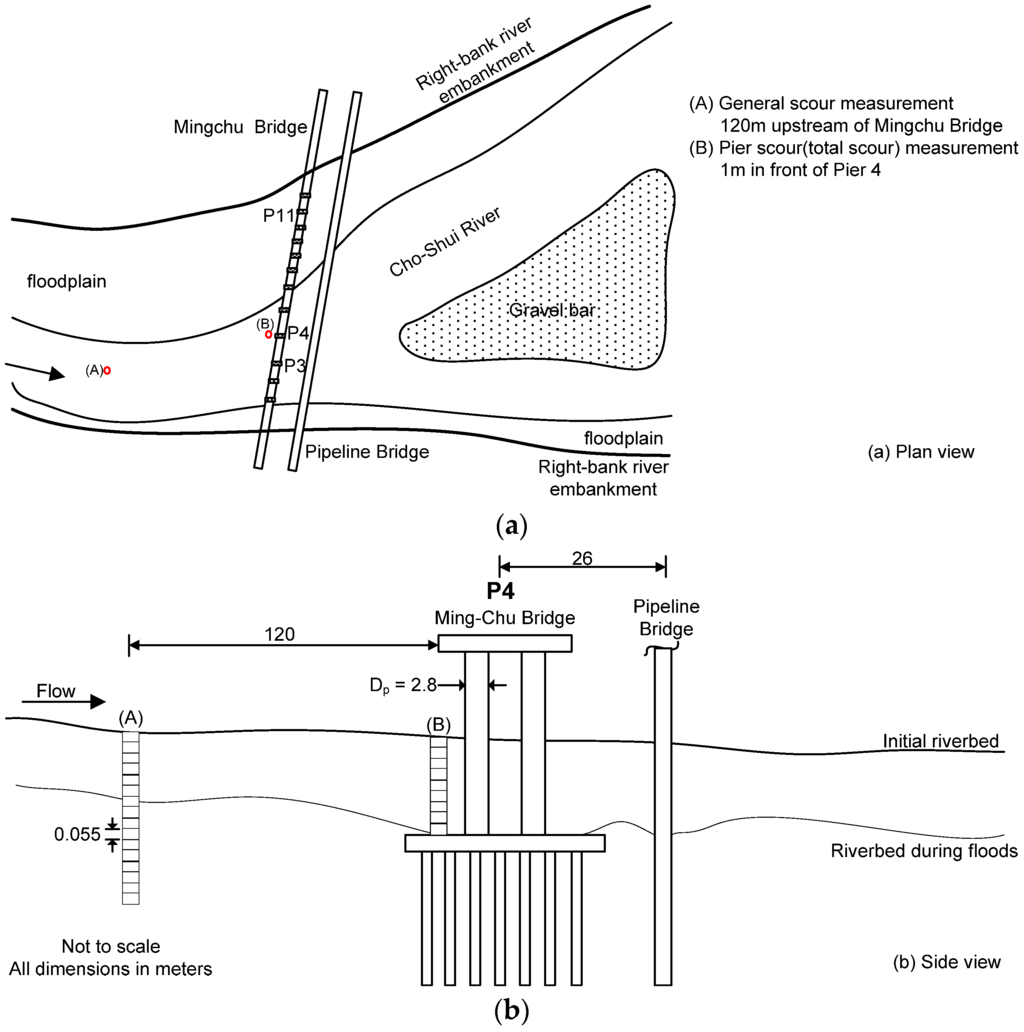 Two “numbered-brick” columns were installed approximately 120 m upstream and 1 m in front of Pier 4; these columns were used for measuring the general scour depth of the riverbed and total scour depth at Pier 4, respectively. Before the flood, the location of each “numbered-brick” column was accurately identified by using a total-station transit after the installation process. After the flood, the precise location of the two brick columns was determined by conducting a survey using the same total-station transit. Excavators were then used to carefully remove the deposited bed materials above the brick column. The number on the first brick of the brick column was recorded. Thus, the maximum general scour and total scour depths were determined by evaluating the number of bricks that were washed away during the flood. Figure 6a,b show the plan and side views, respectively, of the scour measurement system near the Mingchu Bridge.