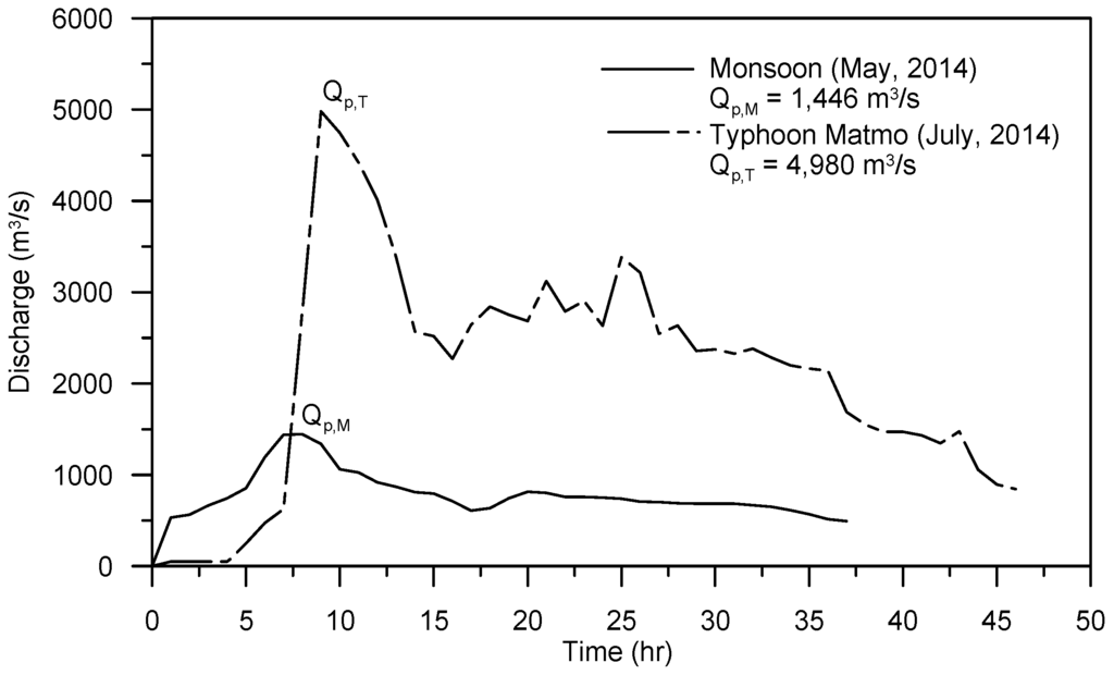 Flood hydrographs for Monsoon and Typhoon Matmo.