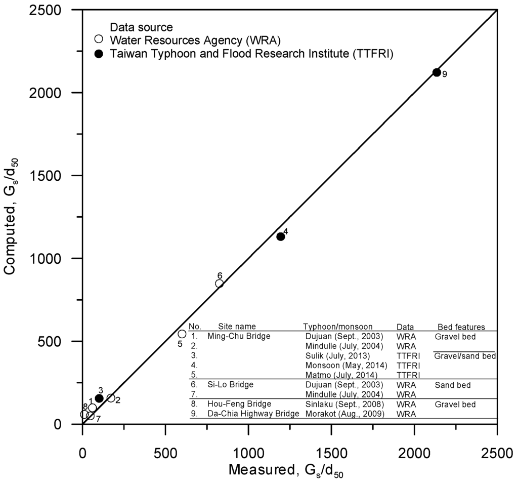 The results of general scour depth measurements are used to propose a reliable general-scour computation equation as described in Section 2.4. In addition, the measured results of total scour depth at Mingchu Bridge were adopted to verify the accuracy of the proposed method as described in Section 4.2.