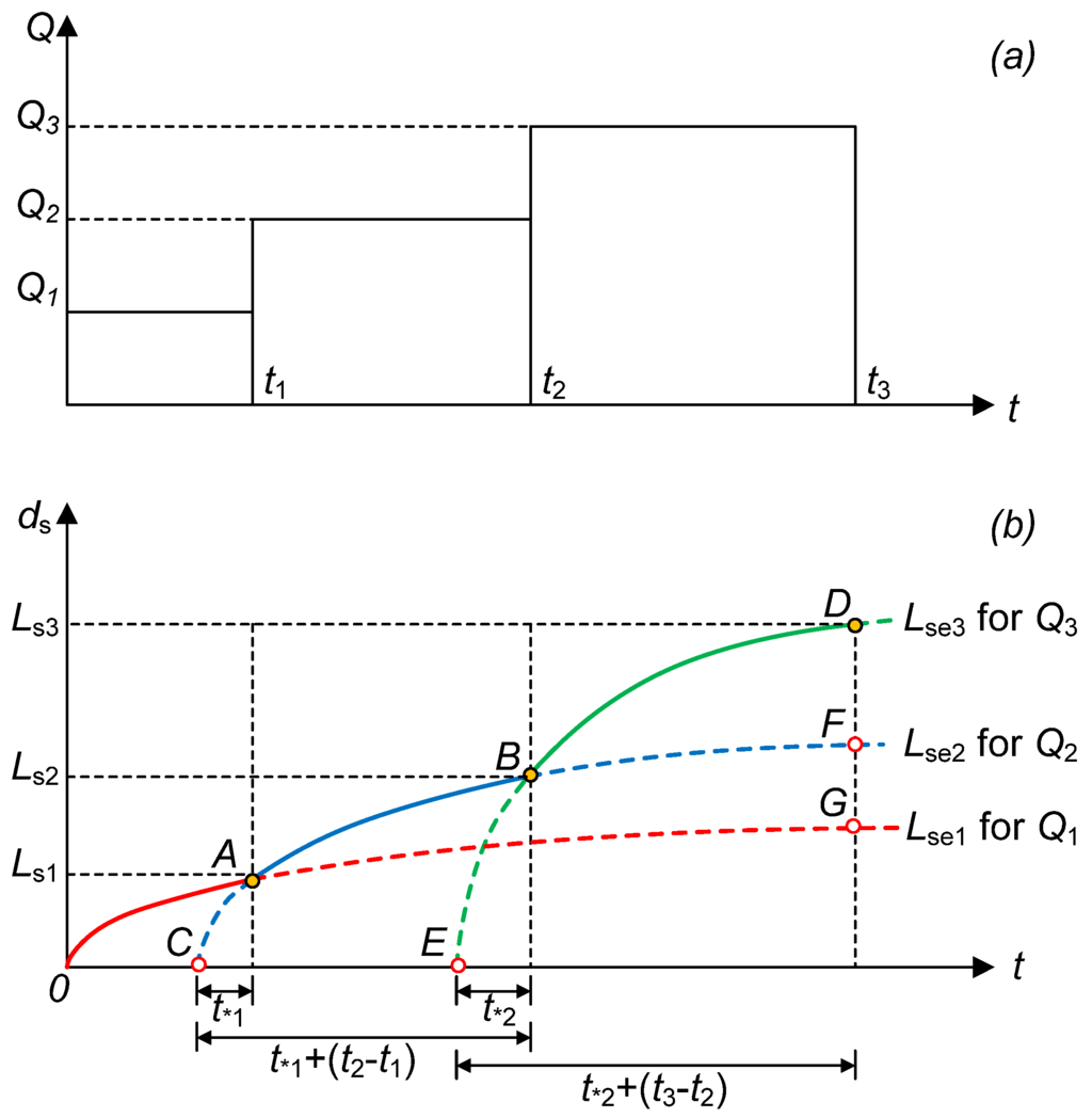 - Similar to the calculation procedure (2), when the flow rate increases from Q2 to Q3 (> Q2), the evolution of the scour depth follows the BD curve under the steady flow condition. Likewise, Point E represents the virtual origin for the scouring process associated with the discharge Q3. Because Q3 > Q2, the time (t*,2) required for the scour depth to reach Ls2 is less than t*,1 + (t2 − t1). The BD curve indicates the corresponding evolution of the scour depth from t2 to t3.