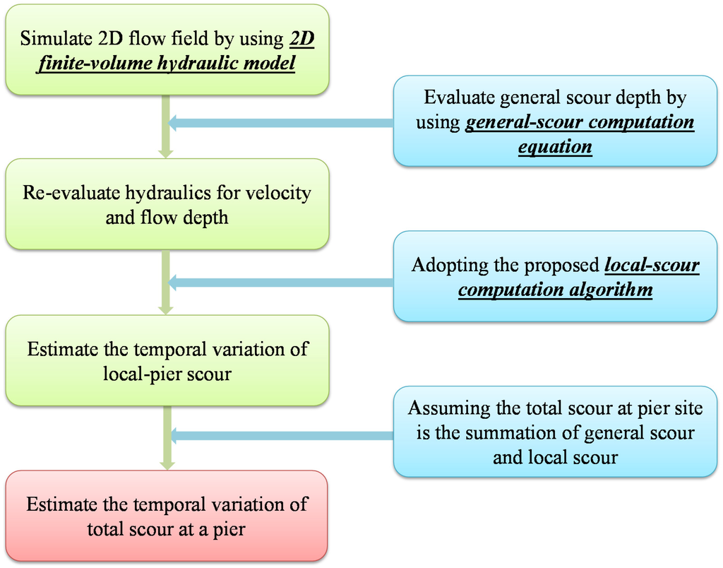 To determine the evolution of total scour depth at a bridge foundation, a simple and reliable method based on the combination of 2D finite-volume hydraulic model and scour computation equation/algorithm was proposed. First, the proposed general-scour computation equation, Equation (5), is combined with the proposed finite-volume hydraulic model to simulate evolution of the general scour depth. For each time step, the finite-volume hydraulic model can give the local flow velocity and flow depth to obtain the unit discharge at each grid. Based on the unit discharge and the proposed general-scour computation equation, the approach flow conditions (upstream of the bridge) are modified. The modified approach flow depth and velocity are then used for the estimation of the local-pier scour. Considering local scouring, this study adopts the local-scour computation algorithm proposed by Hong et al. [15]. The total evolution of the scour depth is finally obtained by simply adding the general and local scour depths.