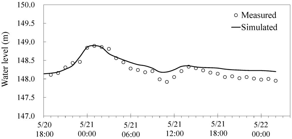 Comparison of the measured water level and the simulated result at Mingchu gauging station during Monsoon (May, 2014).