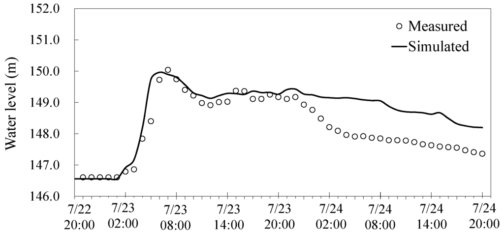 Comparisons of simulated water levels with measured results by using 2D finite-volume hydraulic model.