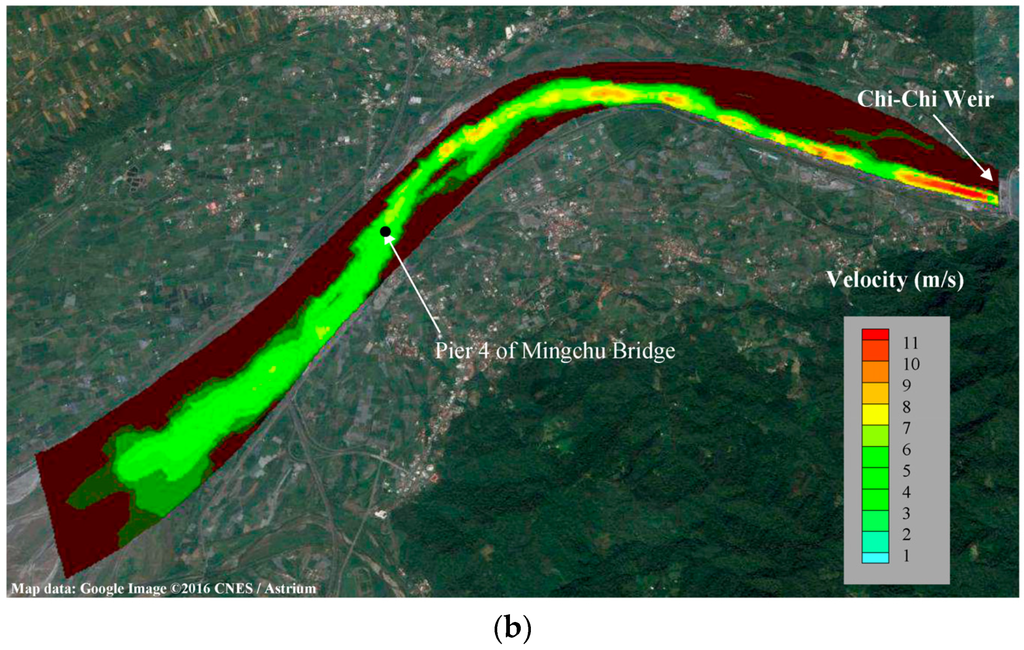Simulated velocity contours in the study reach under peak-flood condition for (a) Monsoon and (b) Typhoon Matmo.