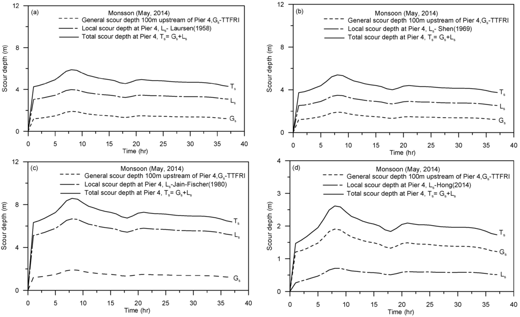 - For simulating the total scour evolution, this study proposed a straight-forward and accurate estimation method. The accuracy of the proposed method is verified from both short-term general scour and total pier-scour depth collected from field measurements. The satisfactory simulated results show that the method can be successfully used to evaluate the development of the total pier-scour depth. In future studies, this method can be coupled with hydro-meteorological modeling for bridge scour forecasting, which can be applied to a real-time bridge scour warning system. This development will provide bridge owners with a superior method to estimate the scoured bed level towards a rational approach for bridge closure decision with a higher level of confidence.