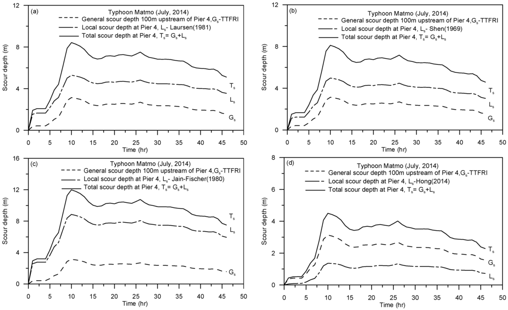 Figure 15 and Figure 16 show the simulated results of the evolutions of the general scour, local pier-scour, and total scour depths at the Mingchu Bridge during Monsoon (May, 2014) and Typhoon Matmo (July, 2014), respectively. In general, all four methods show a similar trend and that the maximum scour depths occur around the peak flow. However, the simulated pier-scour depths are somewhat different, with that predicted using Jain and Fisher’s method [31] showing significantly higher value.