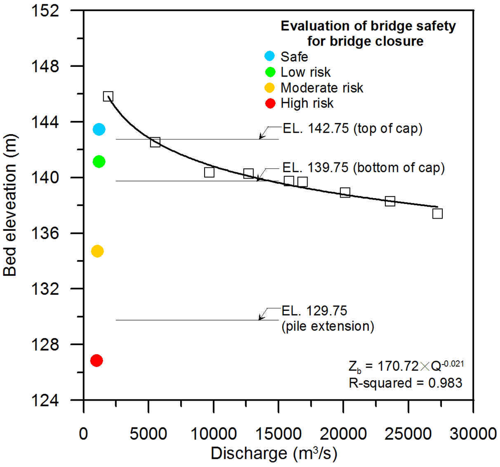 During typhoon seasons in Taiwan, the bridge manager, viz., DGH will need to make a decision for bridge closure, customarily based on the discharge in the river. The premise of this practice is that a high discharge will lead to a deeper scour hole even though the precise relationship between flow depth and total scour depth at the pier generally is not known. By using the proposed method, this study attempts to provide a rational approach to evaluating the influence of discharge on the scoured bed level at the pier. Based on the initial bed level, the calculated total scour depth at the bridge pier is assumed to take place on the approach bed. The numerical experiments are then carried out to evaluate the relationship between the scoured bed level and the corresponding discharge around the Mingchu Bridge in Cho-Shui River in Taiwan. Nine different discharges with 1.11-, 2-, 5-, 10-, 20-, 25-, 50-, 100-, and 200-year return period floods were simulated. A statistical regression analysis is then used to develop the relationship between the scoured bed level with discharge. As shown in Figure 17, the scoured bed level (zb) is uniquely related to discharge (Q) and can be fitted to zb = 170.72Q−0.021 (R2 = 0.983), showing that zb decreases with an increase in the discharge. Using this equation, one can easily deduce the scour depth for a given flow discharge. To provide a reference of the scoured bed level at the Mingchu Bridge, three meaningful levels, namely the top and bottom levels of the pile cap (142.75 m and 139.75 m), and the level of the pile extension (129.75 m), also are superimposed in Figure 17. With these three reference levels, four bridge warning stages, namely safe, low risk, moderate risk and high risk, are identified. For instance, when discharge = 10,000 m3/s, the scoured bed level, zb = 170.72Q−0.021, yielding zb = 140.69 m. The computed scoured bed level lies between the top and bottom levels of the pile cap, which constitutes the “low risk” condition. It is to be noted that for a complex foundation shape as shown in Figure 6b a more accurate prediction of scour depth may be obtained through the methods presented in Ferraro et al. [32]. In summary, the proposed bridge safety curve (Figure 17) enables DGH to make a rational decision on bridge closure during typhoon seasons based solely on the value of discharge because a determinate relationship between discharge and scour has been established.