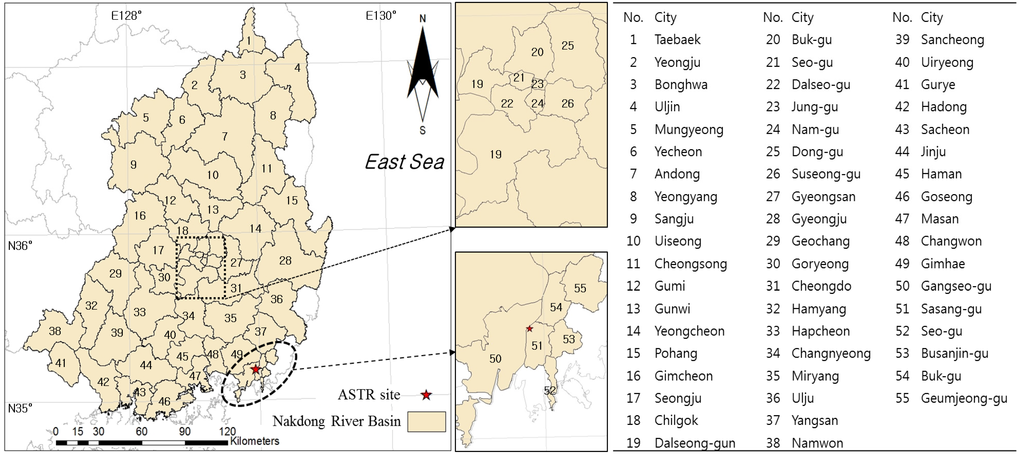 Since the ASTR site is located at the mouth of the Nakdong River, chemicals discharged deliberately or accidentally to the environment in the basin ultimately pass through the site. The basin has previously experienced serious water quality degradation due to chemical leaks [20]. Therefore, it is necessary to analyze the potential risk from chemicals used in the basin in order to supply high quality drinking water in a reliable manner and to prevent from possible chemical-related accidents. The Nakdong River basin consists of 55 cities and, for convenience of analysis, we assigned a number to each city, as shown in Figure 4.