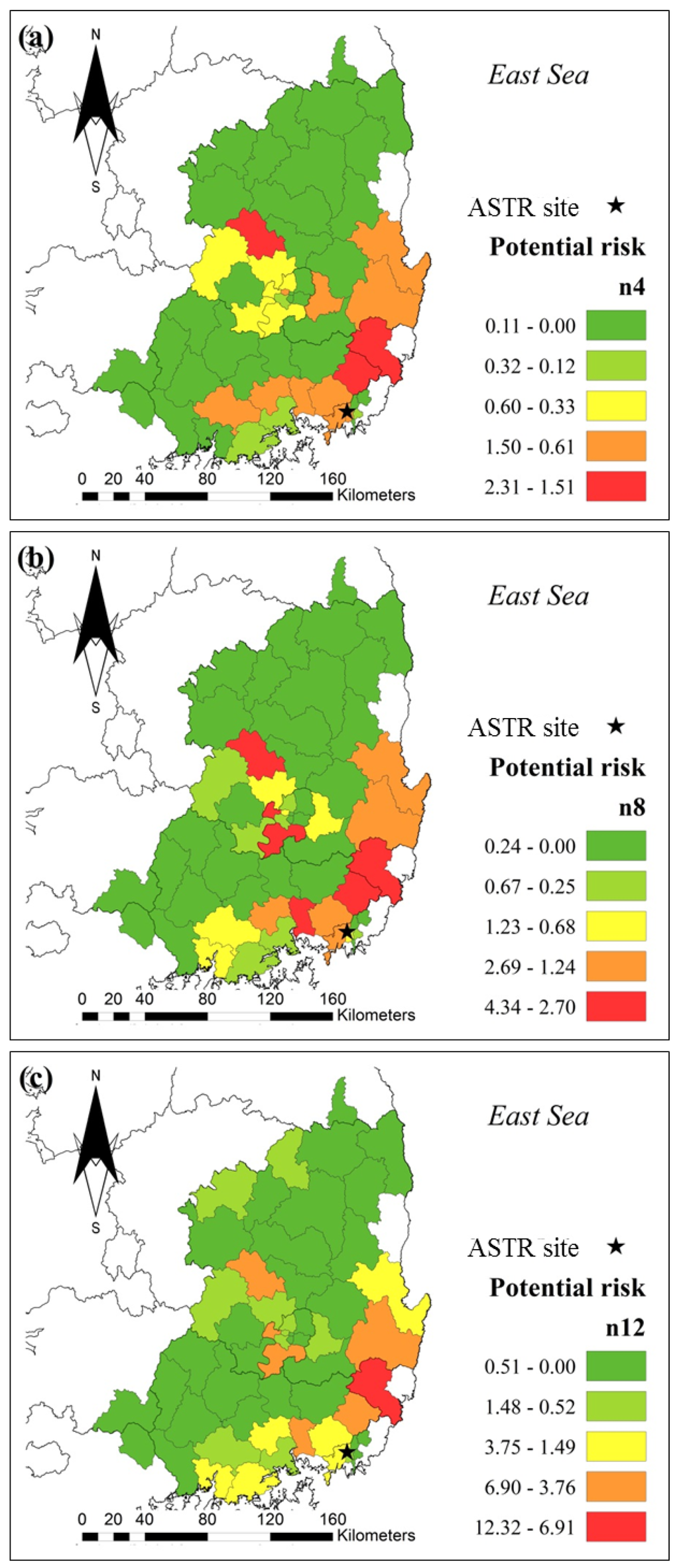 Next, the comprehensive potential risk (Rc) of all chemicals was analyzed. To see a change in potential risk over time, the time of PRTR inventory (n) was divided into three periods: four years (2001~2004), eight years (2001~2008), and twelve years (2001~2012). The results are shown in Figure 6, which gives geologic information of the distribution. The variation becomes much larger while the potential risk is accumulated over time. The maximum values in (a), (b), and (c) are 2.31, 4.34, and 12.32 when the minimum value is always zero. Especially, the difference between (b) and (c) is serious. It seems that industries increased during this time gap. The potential risk caused by cities close to the coast was relatively high: Cities in the coastal regions (city 36, 37, 48) posed higher potential risk to ASTR site than inland cities. City 12 (Gumi) is the only exception. Special attention must be paid to cities whose recent potential risk was ranked low but their past potential risk was high.