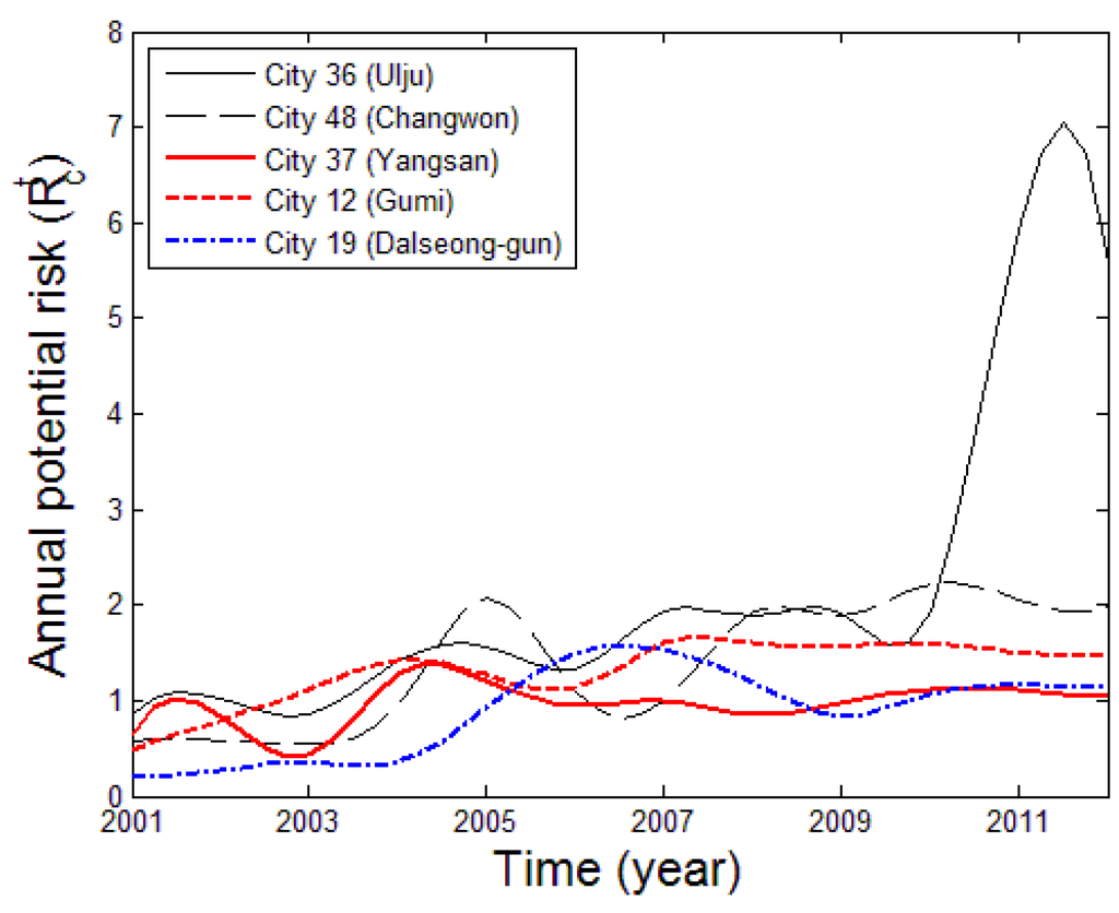 Variation of annual potential risk () for five cities in the Nakdong River Basin.