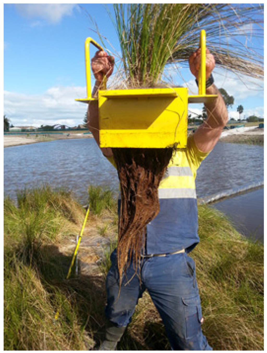 Following these early successes, FTWs have since been used for a variety of purposes including treatment of pollution emanating from mine tailings [,,,], and pollution removal from stormwater [,,,,,,]. FTWs make positive contributions to the health of their aquatic environment by reducing flow velocity which promotes the settlement of suspended solids. FTWs also mechanically filter suspended solids though the interaction of plant roots in the water column (Figure 1) which can grow to a depth of 3 m []. Complex microbial communities (biofilm) also assemble on, and throughout the root mass below the water surface, and contribute to water treatment processes through adhesion, filtration, nutrient uptake (direct use by plants), and sequestration [,]. FTWs have also been acknowledged to contribute to the aesthetic quality of an area []. As FTWs do not require additional earthworks or land uptake, they can also offer increased pollution removal performance at a substantially lower cost compared to alternatives such as constructed wetlands.