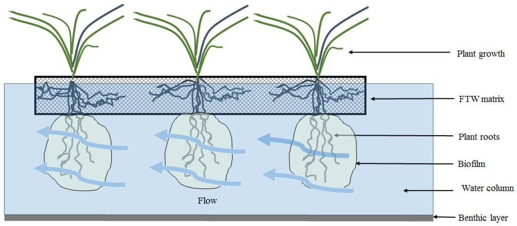Contemporary artificial FTWs are typically constructed using a combination of woven plastic, organic based matting, and fibreglass [,]. Juvenile plants are established directly into this floating matrix, and the roots grow into the water column below (Figure 2).