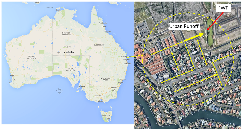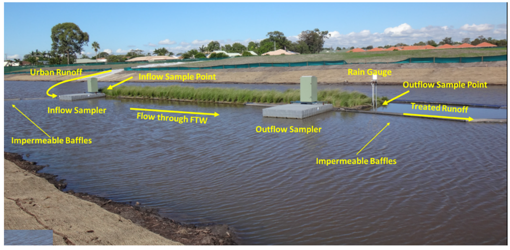 Studies undertaken in the United States and New Zealand [,,,,,,] have found that FTW can provide an effective, low cost, and low maintenance means of treating domestic and agricultural wastewater and stormwater. Tanner et al. [] found that FTW were capable of reducing wastewater TSS by up to 81%, total nitrogen (TN) by up to 34%, and total phosphorus (TP) by up to 19%. Borne [] observed significant reductions in TP as a result of a FTW installation in a stormwater pond. Similarly Borne et al. [] in NZ found FTW retrofitted stormwater ponds to be more efficient at removing TSS. However, there are currently few field studies on the performance of FTW in treating urban stormwater runoff [] and their treatment performance remains largely unknown. This paper describes the results of a twelve-month field study undertaken to evaluate the pollution removal performance of a FTW designed to treat stormwater runoff from an existing urban development in Queensland, Australia.