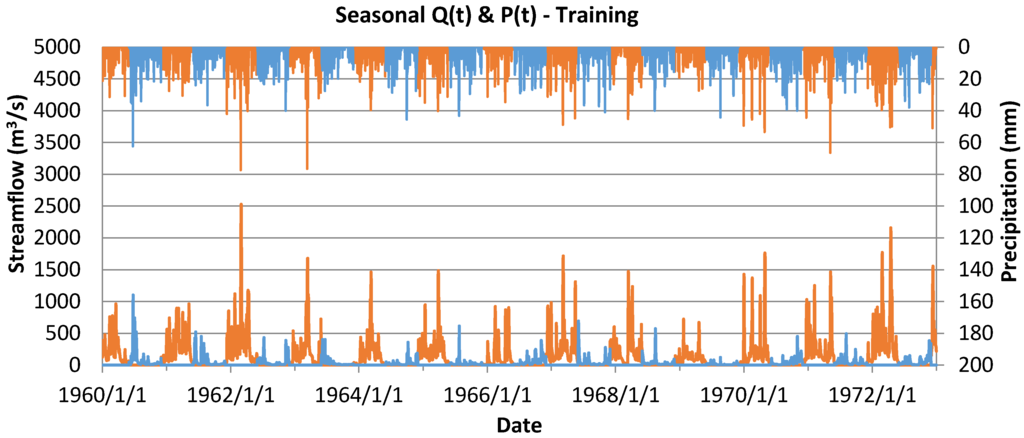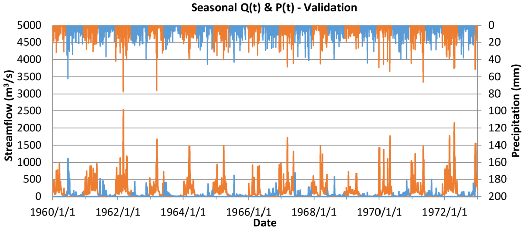 The Kentucky River Basin is a midsize catchment that covers 42 counties in Kentucky and encompasses a dense network of tributaries and streams with a length of 25,700 km. The major tributaries in the basin include: Eagle Creek, Dix River, Elkhorn Creek, Red River, North Fork Kentucky River, Middle Fork Kentucky River, and South Fork Kentucky River. The average slope of the Kentucky River is 0.13 m/km with the elevation of the river ranging from 243 to 305 m above sea level. The yearly average depth of rainfall for the basin is 1168 mm [24], with the climate being described as moist-continental. The average annual temperature within the basin is 13 °C with the minimum daily temperature being near −4 °C in January and February, and the maximum daily temperature being near 31 °C in July and August [25]. Along the Kentucky River there are a series of 14 locks constructed between the mid-nineteenth century to early twentieth century [26,27]. The drainage area influencing the outlet at Lock and Dam 10 is approximately 10,240.8 km2 [10] with the underlying geology being highly karst [28]. Streamflow and precipitation data were obtained from the USGS at waterdata.usgs.gov and consist of 9496 dates split into two 13 year periods from 1 January 1960 to 31 December 1972, and from 1 January 1977 to 31 December 1989. For each model, the first 13-year period was used for model training while the second 13-year period was used for model validation. Consistency in the datasets used allowed for more meaningful comparative assessment. The runoff and precipitation records for each of the two datasets are depicted in Figure 2 and Figure 3.