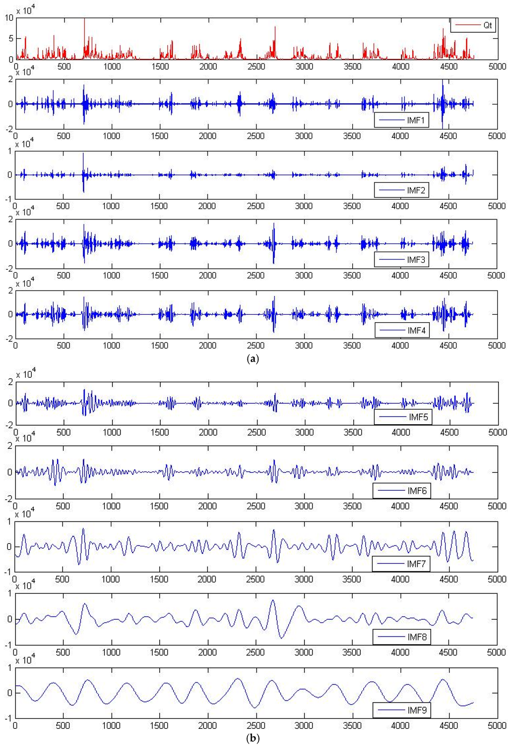 Runoff time-series and IMF (Intrinsic Mode Functions) signal components for validation dataset. (a) Original validation runoff time-series and first 4 IMF components; (b) IMF components 5 through 9; (c) IMF components 10 through 12 and the final residue.
