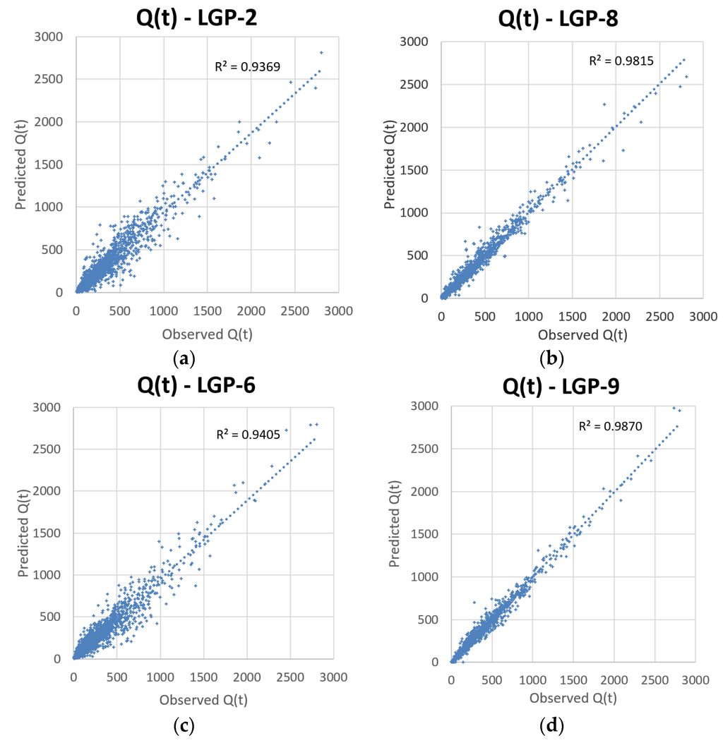 Scatter plots of observed vs. predicted for select models. An improved fit can be seen in the EEMD-LGP (LGP-8) and EEMD-SOM-LGP (LGP-9) models for capturing streamflow. (a) LGP as standalone application; (b) SOM-LGP; (c) EEMD-LGP; (d) EEMD-SOM-LGP.