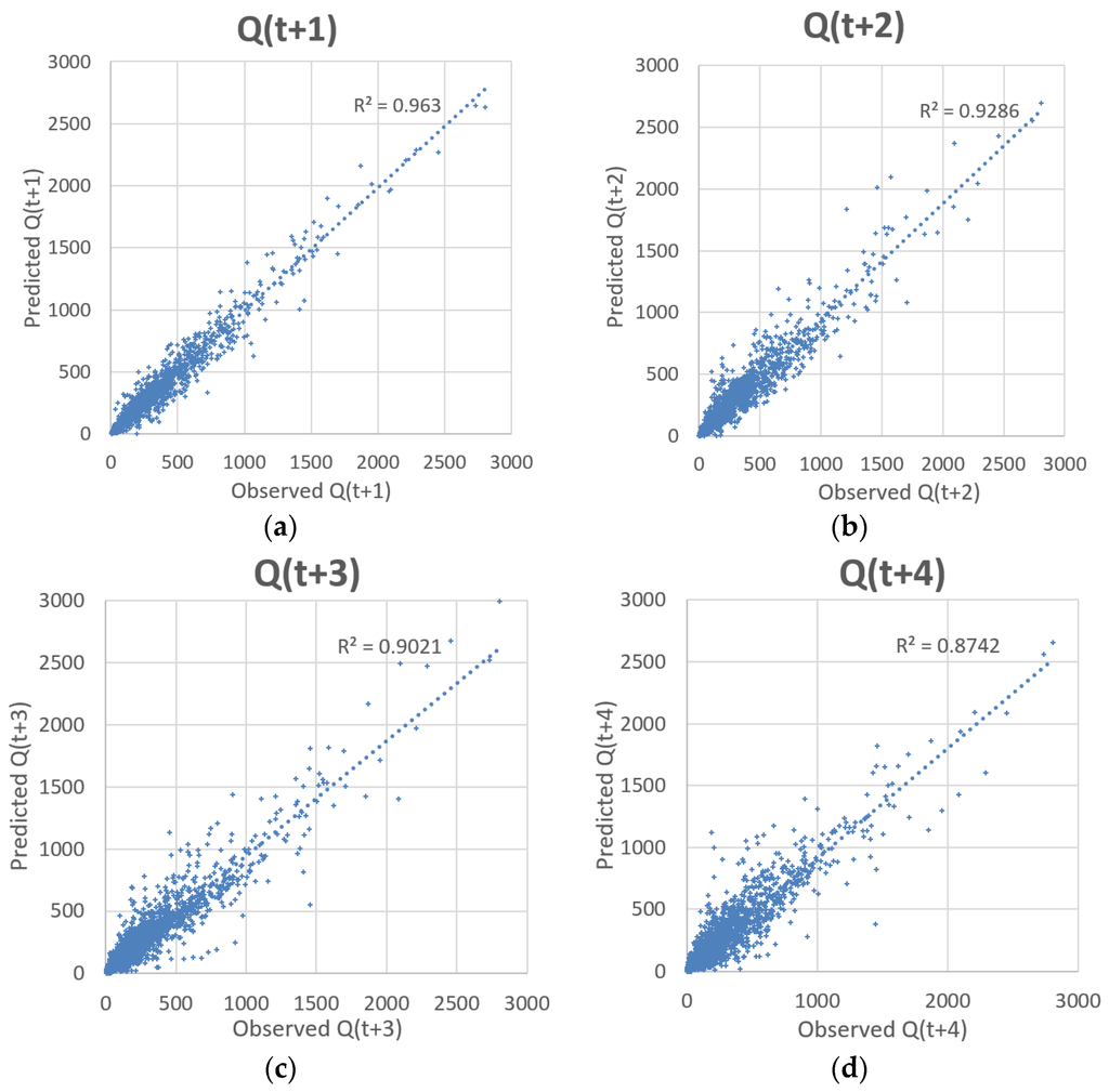 Scatter plots of observed vs. predicted for models in LGP-10. (a) Streamflow at 1 day ahead; (b) streamflow at 2 days ahead; (c) streamflow at 3 days ahead; (d) streamflow at 4 days ahead.