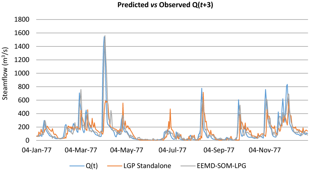 Utilizing LGP as a standalone application to capture streamflow resulted in very similar findings when compared to the best performing ANN model from [10], which was developed over the same dataset and input variables and trained through a genetic algorithm. Classifying the input space through an SOM before modeling each class through LGP did not prove to be worthwhile without the inclusion of EEMD-derived runoff subcomponents. When EEMD-derived runoff subcomponents were utilized with LGP, all the statistical parameters significantly improved, aside from %MF. Including all three techniques together in an EEMD-SOM-LGP structure resulted in the strongest performance of all the reported models. The design also proved highly effective for making predictions multiple time-steps ahead.