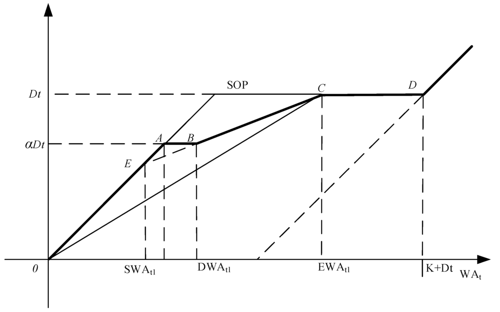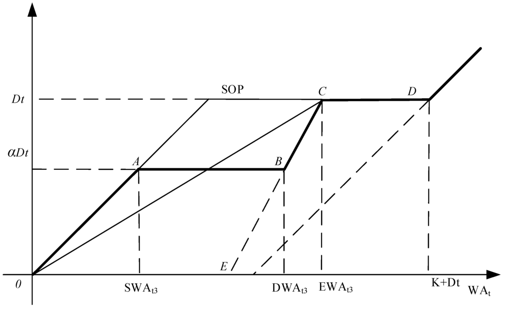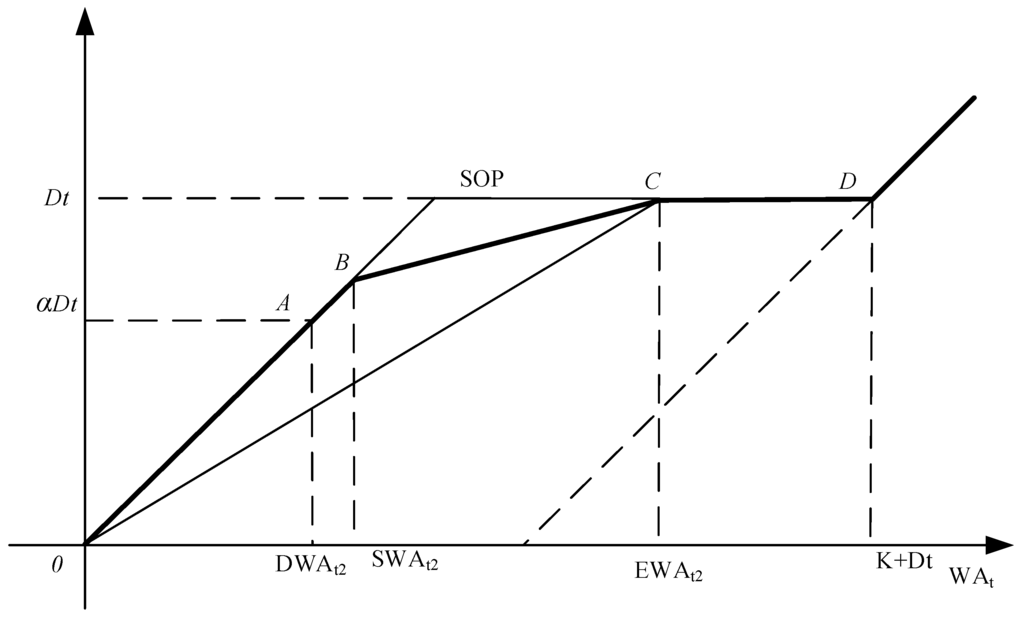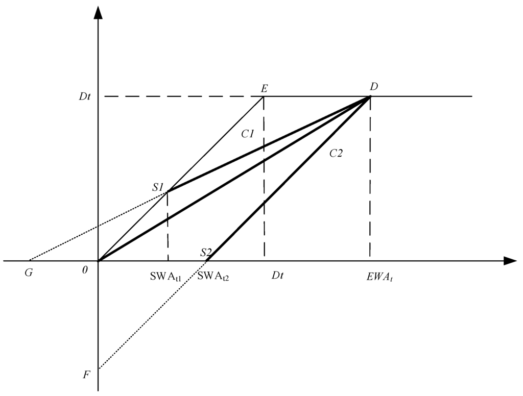 It is shown from Equation (11) that WA is allocated according to the ratio of demand target and storage target, and the two targets get the same satisfaction degree in line OD. Line OD separates area O-S1-D-S2-O into two parts. As D is a fixed point, the slope of any line DS1 in the upper area of line OD is smaller than the slope of line OD. The slope of line DS1 is , so , then . As a result, when WA remains constant, is larger, and the satisfaction degree of the demand target is larger than that of the storage target. On the other hand, the slope of any line DS2 in the lower area of line OD is larger than the slope of line OD. The slope of line OS2 is , so , then . As a result, when WA remains constant, is smaller, and the satisfaction degree of the demand target is smaller than that of the storage target.