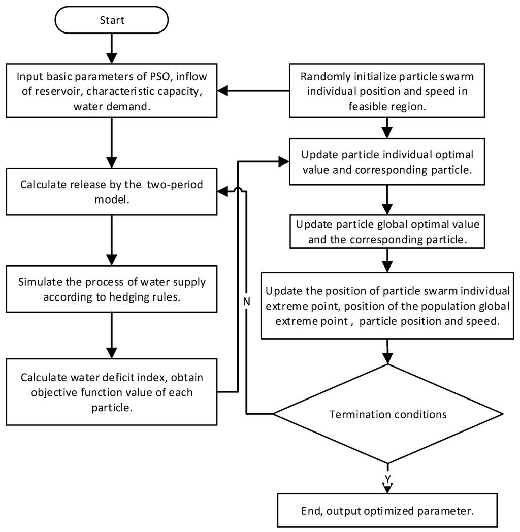 Parameter simulation and optimization models of hedging rules firstly determine a group of decision variables by use of the particle swarm optimization algorithm (PSO). Hedging rules can guide reservoir operation by this group of decision variables. The process of water supply is simulated in each period. The final statistical index uses the SI as the fitness value, and decision variables are readjusted by the PSO. Parameter simulations and the optimization model repeat the above steps again until the objective satisfies the requirements. The process is shown in