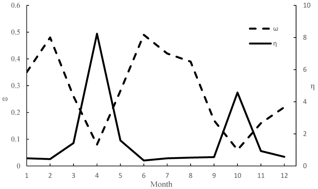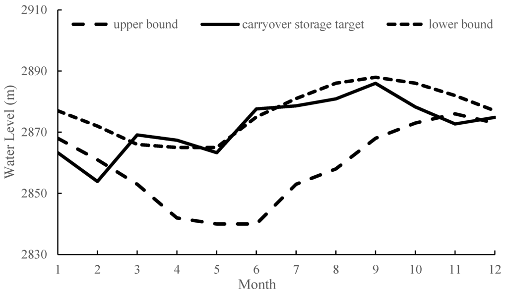 While the value of ω has a gradual increasing trend, the storage target changes smoothly from Novermber to Feburary in the following year. In this period, ω is smaller than 0.5, ηt is smaller than 1, and the storage target is mostly under the lower bound. It shows that the satisfaction degree of the release target is larger than that of the storage target in this period. In this period both the reservoir inflow and water demand is less, because this period is in the dry season, and there is no water supply for agriculture. Thus, water stored in the flood season can be used to avoid water supply damage in the beginning of this period. Consequently, the carryover storage target should be kept at a lower level to reduce the hedging water supply interval. With the decrease of stored water in the flood season, it is necessary to increase the water supply by increasing the value of ω during the hedging period.