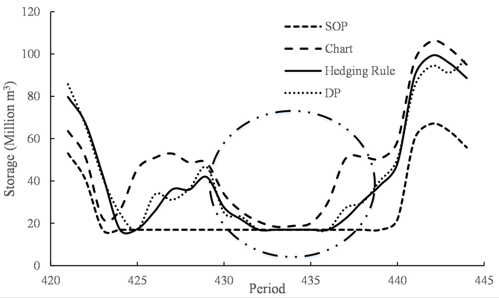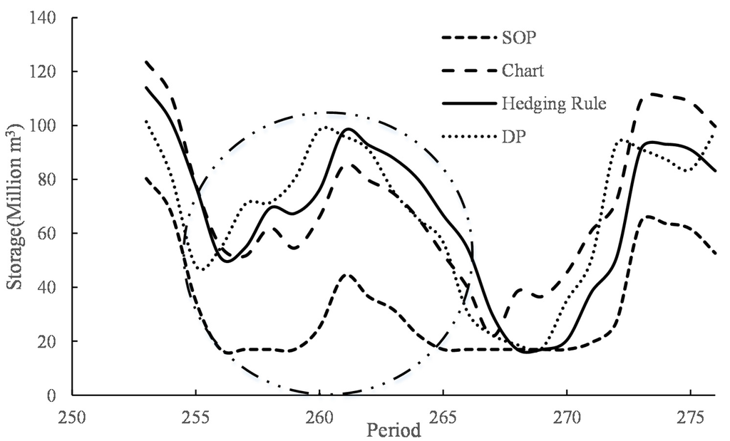 Figure 9. Before the successive water-deficiency period, water is impounded in advance in Period 256–262 under the scheduling chart and HR. The reservoir stores water only at the end of flood season (Period 260–262) under the SOP rule. Thus, the storage water under the operation chart and HR is more than that under SOP at the beginning of the successive water-deficiency period (Period 263). In addition, the water supply hedging coefficient is fixed under the scheduling chart, so water supply cannot be adjusted according to the dry season. Water stored in advance cannot satisfy water supply requirement in the successive water-deficiency period, leading to deep damage. HR can guide the reservoir to carry out different levels of hedging the water supply at different periods by optimal reservoir release and avoid the deep damage better.