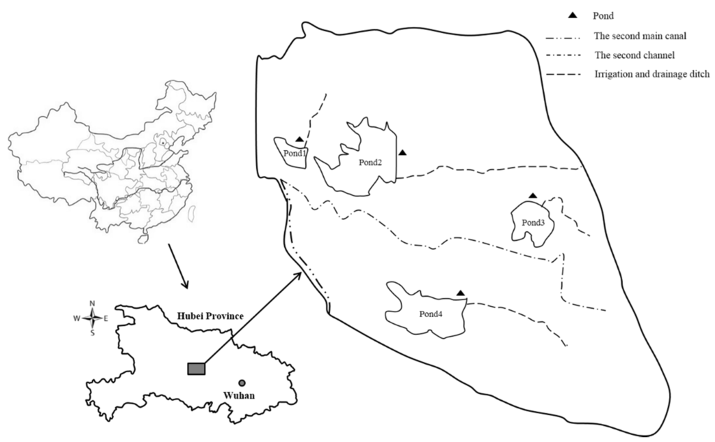 In recent years, the mismatch between supply and demand of irrigation water resources has become increasingly serious [1,2]. Simultaneously, seasonal drought is becoming increasingly common and agricultural irrigation is increasingly reliant on ponds [3]. Irrigation ponds are a type of water-supply structure that is small in size, and are also referred to as on-farm irrigation tanks or on-farm reservoirs. These structures are widely distributed in Southern China, Southern India, and Sri Lanka [4,5,6,7]. The ponds play an important role in decreasing peak flow in main irrigation channels, reallocating water in irrigation districts, enhancing water-efficient irrigation, and supplying water for crop production [2,4,8,9,10,11,12,13]. Ponds in Southern China not only capture surplus water from the irrigation system and agricultural return water from upstream fields, but also supply water to downstream fields [9,10,14]. The water provided by ponds for irrigation accounts for over 60% in the Zhanghe Irrigation District (ZID) [3].