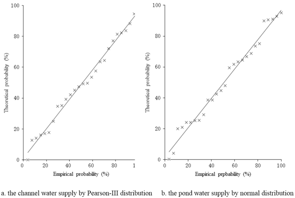 The observed rainfall data from 1981–2010 are ranked in descending order, and the empirical probability can be estimated with the Weibull formula. Hydrological years with frequencies of 50%, 75%, and 95% (namely, the years 2006, 1990, and 2010, respectively) are selected to represent three types of typical situations, i.e., normal, dry, and extremely dry years, by assuming that the historical hydro-climatic conditions would occur again in the future. The pond water supply frequency (PWSF) in the selected typical years is 17.86%, 67.86%, and 28.57%, respectively, and the corresponding channel water supply frequency (CWSF) is 42.86%, 89.29%, and 53.57%, respectively. The results suggest inconsistency in the water supply frequency and rainfall frequency. Thus, an irrigation water strategy failure analysis based on different water supply frequencies is essential.