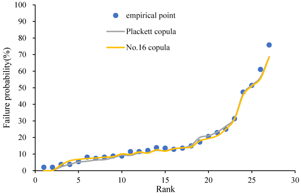 As discussed in the previous sections, the best fit copula can also be determined by comparing the AIC and BIC values when the probabilities of the CPJM failure produced by different copulas differ greatly. In consideration of the fluctuation range of the CPJM failure probability, smaller fluctuation ranges may result in higher precision of the probability. Within the set of copulas, let {Gaussian, Plackett, Frank and No.16 copulas}, then an index of fluctuation range, , can be defined as [44]: