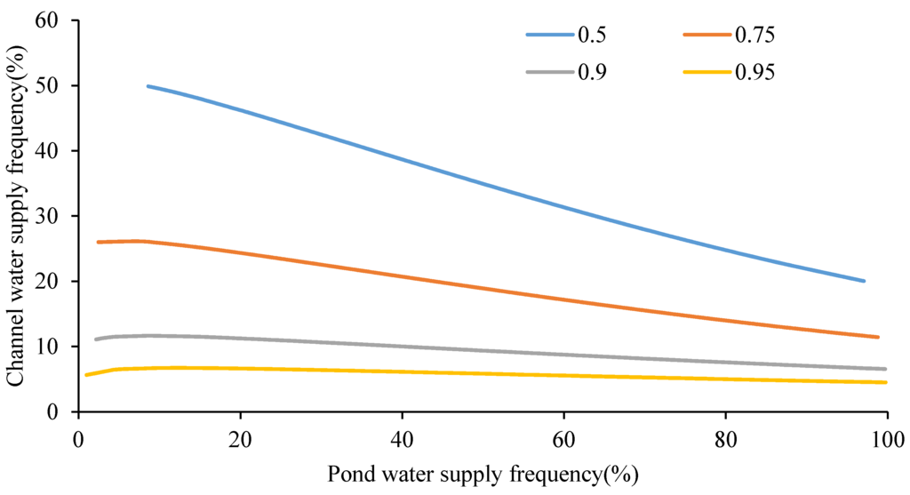 Channel water supply frequency with given pond water supply frequency under different mode failure probability based on the Plackett copula.