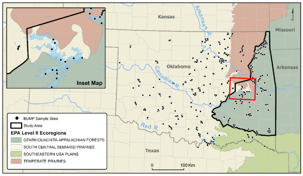 The Ozark/Ouachita-Appalachian Forest ecoregion (OOAF) is located in eastern Oklahoma (Figure 1). The Neosho River, with sources in Kansas, Missouri, and Arkansas, is the longest water system. Important uses of the watersheds in this region include the freshwater supply for Tulsa, Oklahoma (a metropolitan area of about 1 million people), the largest recreational lake in Oklahoma (Lake Eufaula), and tourism along the Illinois River, which is an Oklahoma Scenic River. Since the ecoregion boundary bisects many of the major lakes in the region, the boundary was modified slightly to encompass these water bodies (Figure 1–inset).