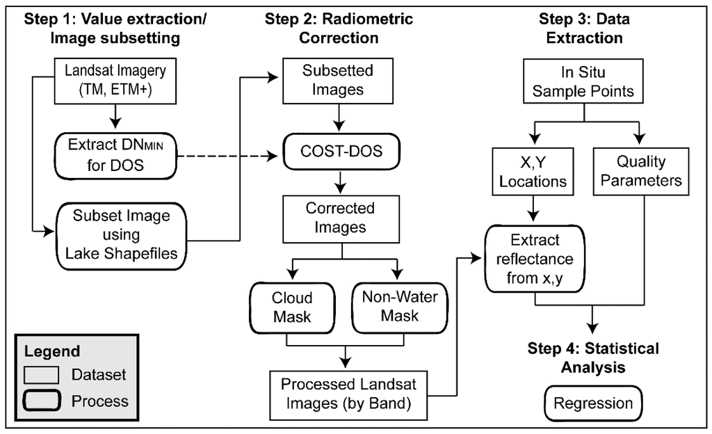 The processing methodology (Figure 2) includes four stages: (1) minimum value extraction and image subsetting; (2) radiometric correction including water and cloud masks; (3) extraction and averaging of spectral reflectance values in sample point windows; and (4) statistical analysis (i.e., regression). The first three stages are automated through the Python script. Once reflectance values have been extracted, statistical correlations and regressions can be built by the user to determine relationships between water quality parameters and surface reflectance. It should be noted that Landsat surface reflectance products can be substituted for raw imagery when available, which eliminates the need to perform Step 2. This step can easily be skipped in the processing code by toggling it off.