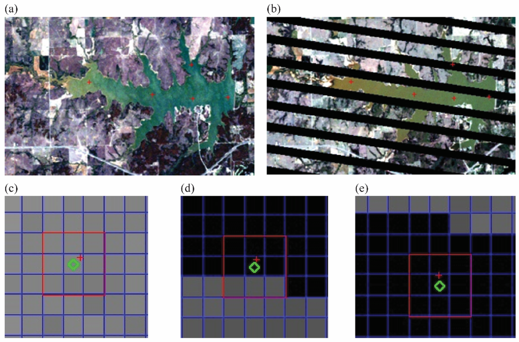 Sampling points (red crosses) overlain on (a) a normal image; (b) an image with scan line corrector off (SLC-off) voids, Bottom images show; (c) a fully intact nine-pixel sample window; (d) a partially occluded sample window; and (e) a fully occluded sampling window.