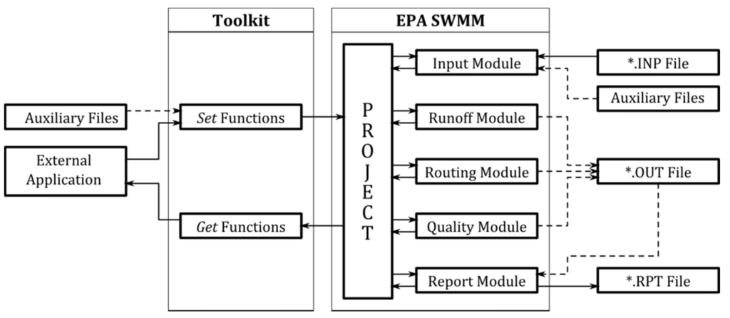 The library is made up of three different groups of functions. First, the project management functions will be enclosed in the group of interfacing functions provided by the USEPA within the program. The second group consists of those functions that are associated with data and result gathering. These functions can be referred to as Get functions. Finally, a data modification functions (denominated as Set functions) were included in order to give the library a greater degree of flexibility.