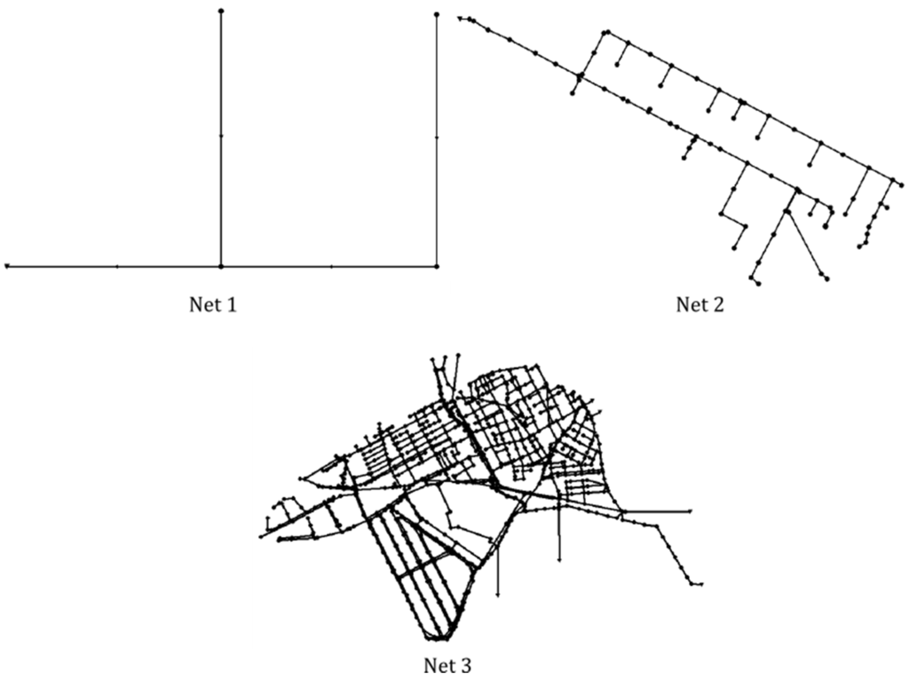 In order to see the effect that is obtained as a result of modifications in network size, three specific networks have been chosen and they are shown in Figure 3. The first network (Net1) corresponds to the network that is available in the program’s manual [14]. It is rather simple, as it consists of 5 nodes and 4 pipelines. The second network (Net2) is obtained by simplifying the sewer network of a district of Bogotá (Colombia) and consists of 82 nodes and 83 links. Finally, the third case corresponds to the Xirivella network (Spain). This network possesses all the elements that are typically found in a network, such as pumping stations, sewer overflows, waste water treatment plant, etc. It has 916 nodes and 931 links.