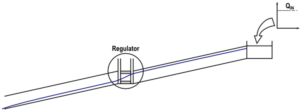 Second, a much simpler network was used to study specific control structures, as is the case of weirs, orifices and pumps. The reason for using a specific network for control structures derives from the way EPA SWMM calculates these types of devices. This way, different situations may be simulated (normal behavior, orifices behaving as a weir or weirs behaving as an orifice for surcharge conditions). Figure 5 shows a sketch of this network, which consists of a storage unit with a constant direct inflow so that a steady flow regime may be reached. Likewise, the outfall is simulated as a free discharge. Conduits are long enough to allow them to reach the uniform flow in their middle points. Direct numerical calculations can thus be done, and they can be contrasted with those obtained with both EPA SWMM and Toolkit.