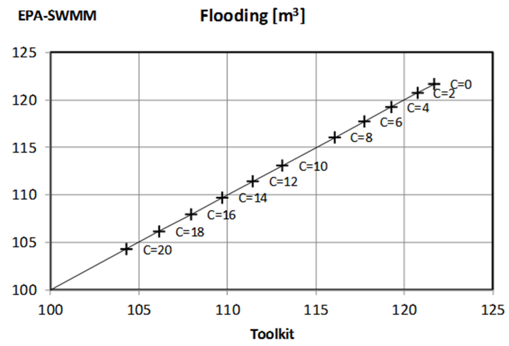This set’s testing protocol will be briefly described. For each case within the set, three tests were carried out. The first included the analysis of the results obtained using EPA SWMM with a series of values of the analyzed parameter (10 different values ranging between a minimum and a maximum). Next, these same cases have been processed using the Toolkit and without parameter modification, that is, reading each of the 10 prepared archives. Finally, the obtained results have been analyzed by performing 10 calculations in one single process that used Set functions in order to modify parameters. As an example, Figure 6 compares the results obtained when modifying storage capacity. The data collected for each of the storage volume include maximum discharges at entrance and exit pipes as well as total flood values for the initial and the final nodes. The results obtained through the use of the library have been represented on the horizontal axis. In the vertical axis, instead, those results directly obtained using EPA SWMM are represented. As expected, the results are 100% coincidental.