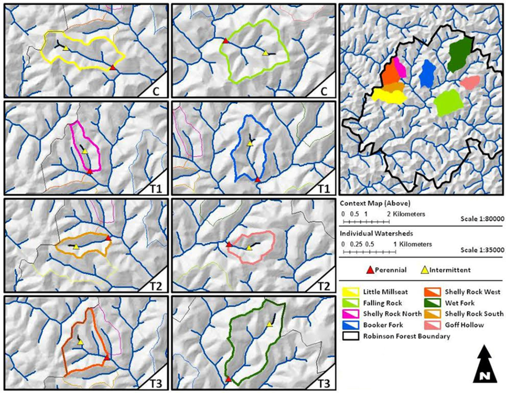 Robinson Forest is an approximately 6000 ha experimental forest located in portions of Breathitt, Perry and Knott counties, Kentucky. This study was conducted on the main block (outlined in black) in the 1538 ha Clemons Fork watershed. Falling Rock and Little Millseat branches represent the unharvested control (C) watersheds. Shelly Rock North and Booker Fork are treatment 1 (T1) watersheds. Shelly Rock South and Goff Hollow are treatment 2 (T2) watersheds. Shelly Rock West and Wet Fork represent treatment 3 (T3) watersheds. Perennial (blue line) and intermittent (black line) stream segments were created in ArcMap using a 10 m Digital Elevation Model and the Hydrology tools in Spatial Analyst. Adapted from Witt 2012 [30].