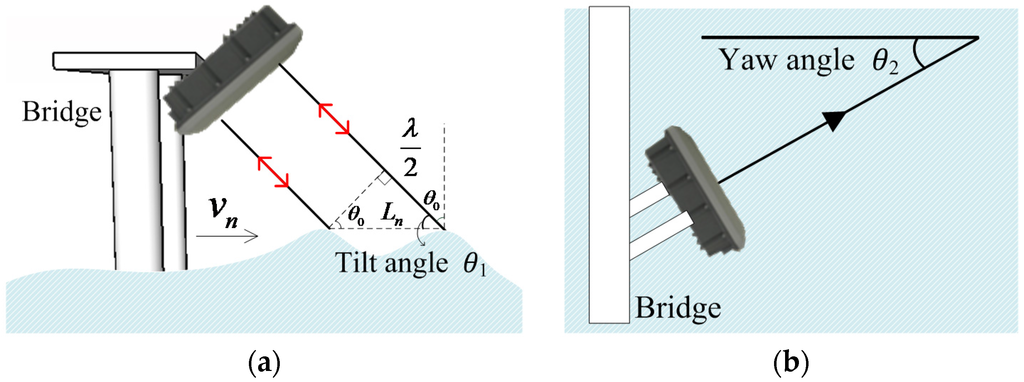 The continuous microwave radar surface current meter calculates the surface velocity of the river by using the Bragg scattering and the Doppler shift of the reflection of the radar waves, caused by tiny ripples on the stream surface. Therefore, the setup of the tilt angle (the angle between the horizontal plane and the direction of the radar wave transmission) and the yaw angle (the angle between the mainstream direction and the direction of the radar wave transmission) affect the measurement results of the surface velocity apart from the influence of the stream conditions of the rivers. Limited by environmental factors, the measurement direction is not guaranteed to be in parallel with the mainstream direction; thus, the reflected waves received by the microwave radar may not be reflected by the ripples moving in the mainstream direction. A Doppler radar instrument enables the calculation of the component of the velocity vector of the target along the beam. Unless the beam is parallel to the main flow velocity (tilt angle and yaw angle, both equal to zero), this component differs from the actual flow velocity. While the drift angle can be zero (for example, if the instrument is placed on a bridge), the depression angle is always larger than zero for a non-contact water survey setup but, in both the cases, their effect can be calculated using trigonometric relationships.