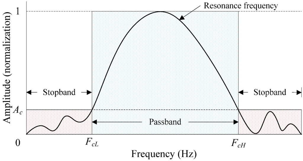 An ideal bandpass filter has a completely flat passband (i.e., with no gain/attenuation throughout) and will completely attenuate all the frequencies outside the passband. Additionally, the transition out of the passband will have brick-wall characteristics [30], as shown in Figure 3. The resonance frequency is the difference between the cut-off frequency, FcL, of a lower frequency band and the cut-off frequency, FcH, of a higher frequency band; the bandpass width of the filter is the difference between FcL and FcH.