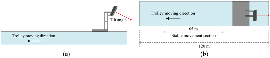 A 10.525 GHz microwave radar surface current meter (test model before the product development, resolution: 0.01 m/s, voltage: 12–36 VDC, temperature: −35–60 °C, ingress protection: 65) was adopted. The experiments were conducted at the Laboratory of Current Meter Calibration of the Water Resources Planning Institute, Ministry of Economic Affairs that is the only current meter calibration laboratory approved by the Taiwan Accreditation Foundation (TAF). The calibration trolley in the laboratory has a calibration speed of 0.3–6.0 m/s, minimum uncertainty of 2%, and a minimum speed of 0.2 m/s. The length and width of the experimental channel are 120 m and 1.6 m, respectively. The trolley initially advances slowly, accelerating gradually and moves at a constant speed when it reaches the set location (start of the stable movement section). It then decelerates and ultimately stops after moving for 65 m in the stable movement section. The instrument is fixed on the stainless steel shelf on the trolley for the measurement (as shown in Figure 4). The water surface is still during the measurement, and ripples appear on the water surface as the trolley moves; therefore, the radar wave reflected signals could be measured for calculating the errors incurred by the different analytical methods, while identifying the surface velocity and the actual movement speed of the trolley, as shown in Equation (11):