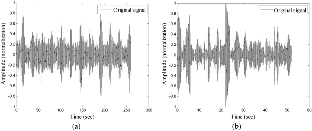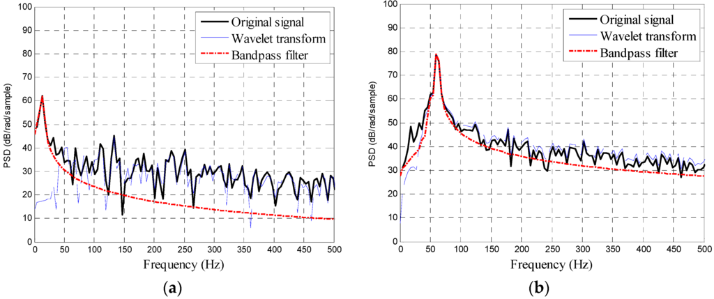 where is the composition of the detail signals and is the composition of the approximation signals. The Daubechies wavelet function used in this study, was adopted as the wavelet transform filter and the dmey function (discrete approximation of the Meyer wavelet) of MATLAB was employed for decomposing the wavelet into five detail signals and one approximation signal. It is difficult for the wavelet signals to set the filter for an automatic switchover between the compositions of the detail/approximation signals; moreover, the different numbers of the decomposed signals can affect the differences in the composed signals. Therefore, a bandpass filter was adopted to conduct an additional signal analysis to filter the noise.